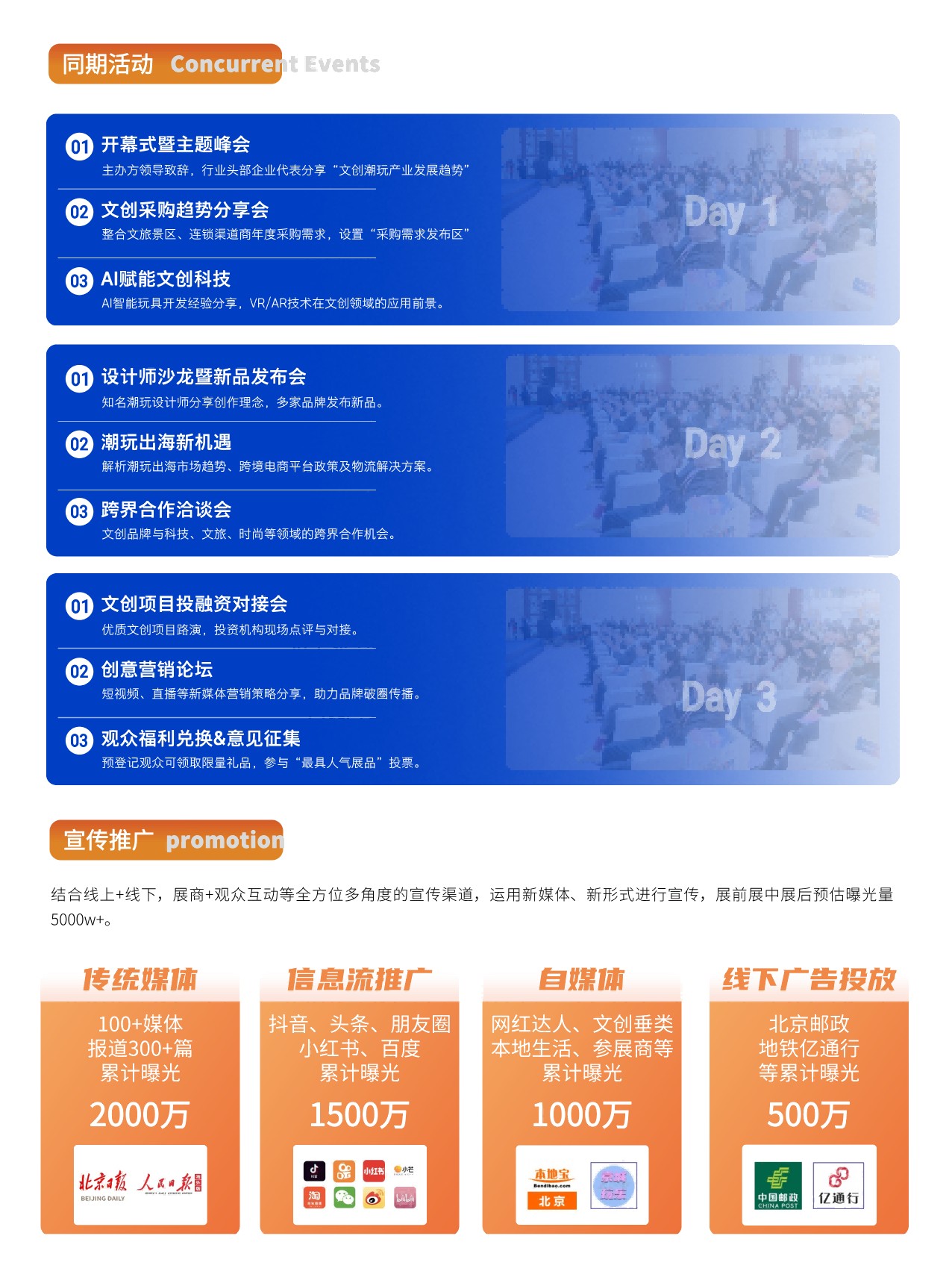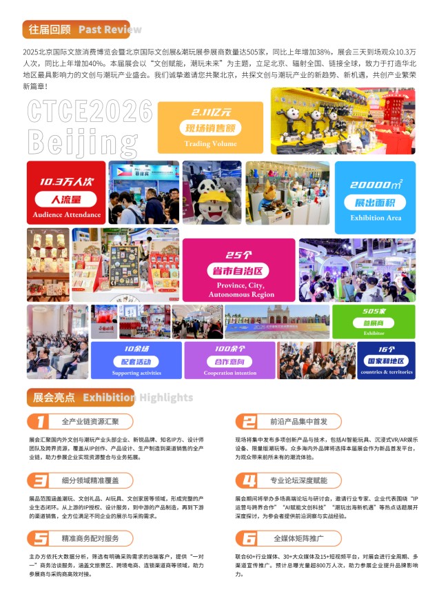 2026北京国际文创展与潮玩展将打造本年度最具影响力的行业盛会。本届北京文创展携手众多权威媒体,通过抖音、视频号等线上平台与线下户外广告形成立体传播矩阵,实现全方位曝光。作为华北地区规模领先的潮玩博览会,展会精心设置文创礼品展区与AI玩具展区等特色展区,全面展现产业前沿成果。这场盛大的2026文创展会不仅是产品展示平台,更是推动“文创+科技”融合发展的创新舞台,诚邀您共襄盛举!